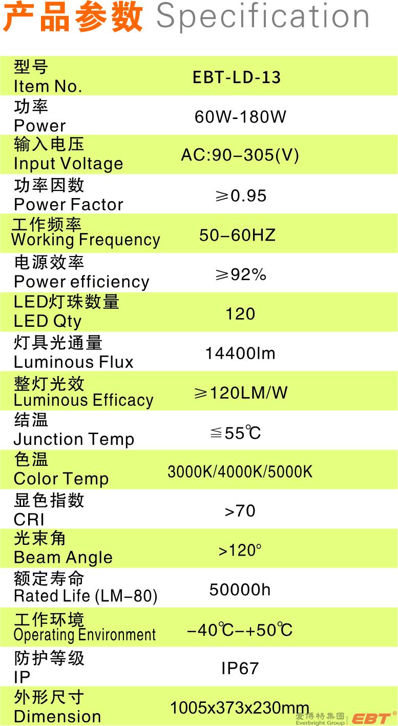 產(chǎn)品描述:采用國(guó)際知名品牌芯片,高亮度,低光衰; 防水防塵防腐蝕; 采用通孔結(jié)構(gòu)散熱,使用壽命長(zhǎng); 科學(xué)配光,適用多種場(chǎng)所。